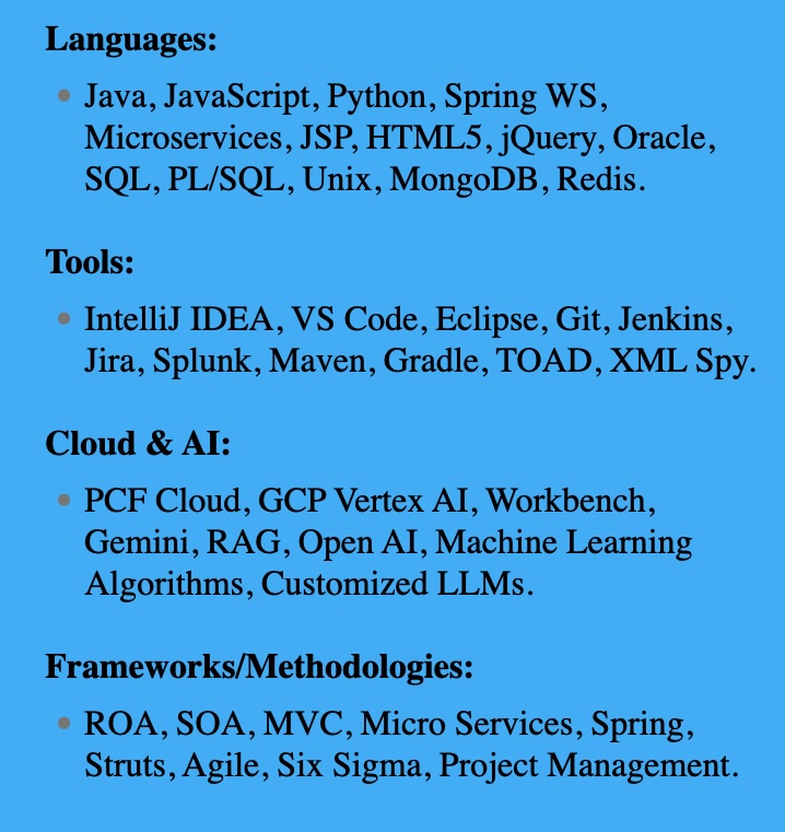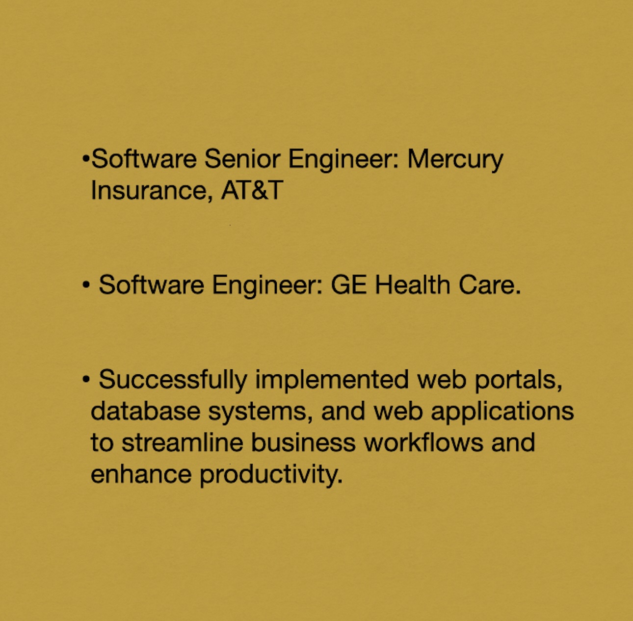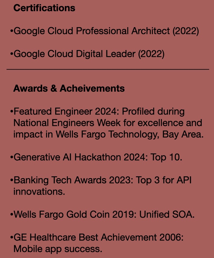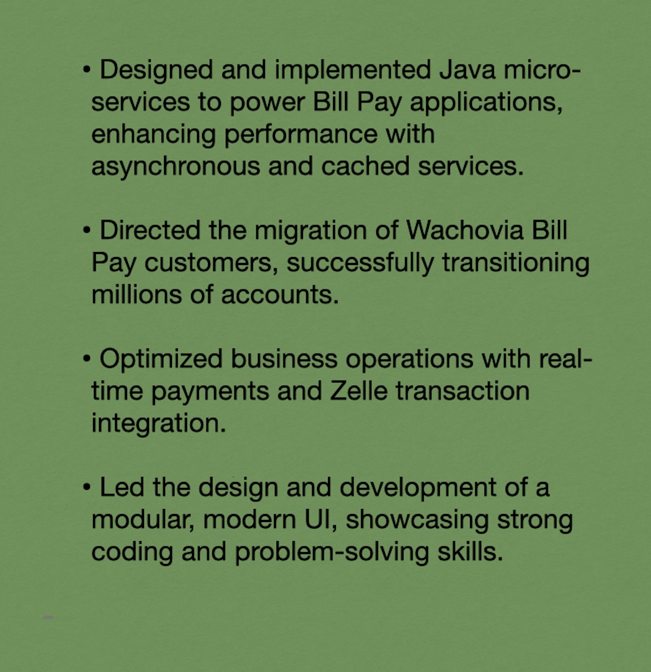 I am a Senior Software Engineering Manager with over 20 years of expertise in building scalable payment platforms, leading cloud migrations, and driving AI-based innovations. At Wells Fargo, I led transformative initiatives such as developing predictive AI for payments, optimizing test frameworks, and enhancing customer experiences through robust APIs and real-time payments integration. My previous roles at Mercury Insurance, AT&T, and GE Health Care honed my skills in implementing enterprise portals, database systems, and web applications. With a focus on leadership and innovation, I strive to deliver impactful, high-performance technology solutions.
