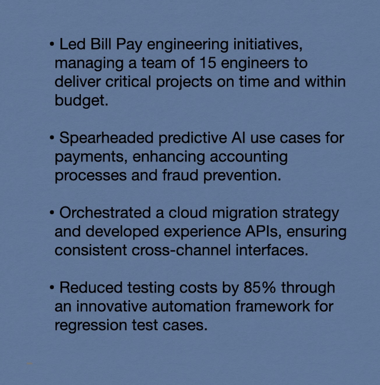 I am a Senior Software Engineering Manager with over 20 years of expertise in building scalable payment platforms, leading cloud migrations, and driving AI-based innovations. At Wells Fargo, I led transformative initiatives such as developing predictive AI for payments, optimizing test frameworks, and enhancing customer experiences through robust APIs and real-time payments integration. My previous roles at Mercury Insurance, AT&T, and GE Health Care honed my skills in implementing enterprise portals, database systems, and web applications. With a focus on leadership and innovation, I strive to deliver impactful, high-performance technology solutions.